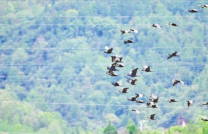 金秋时节,神农架林区迎来候鸟大规模南迁。每年九月和十月,鹅、鸭、滨鸟和各种北方猛禽沿着迁徙路线从东亚向南迁徙到澳大利亚。神农架湿地资源丰富、森林茂密、食物来源丰富,成为这些长途候鸟的重要“中途停留地”和“补给区”。图为10月18日,松柏市与阳澧市交汇处的南河流域,候鸟飞翔。(湖北日报记者万雷猛、通讯员韦家峰、于杰、李娇娇、江林拍摄)
